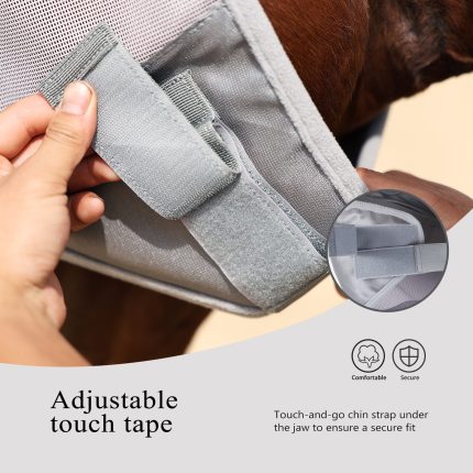 SECURE FIT OVER THE BRIDLE: Easily and quickly attaches over the bridle. One adjustable touch-and-go tape under the jaw ensures a safe closure for a proper fit while allowing the mask to stay in place.