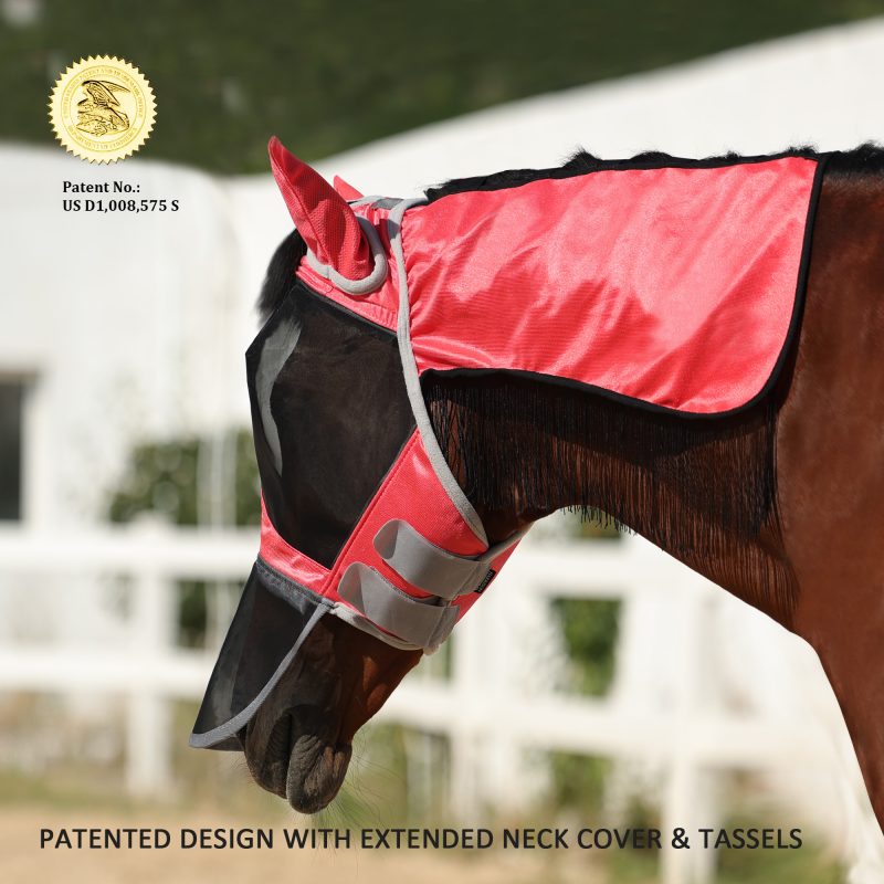 Innovative Patented Design: Experience superior protection with our unique tassel cape style fly mask. Designed with an extended neck cover and a top opening, it accommodates horses with a large forelock comfortably. The extended back coverage, adorned with tassels on the sides, ensures added protection against flies and insects. Patent No. US D1,008,575 S