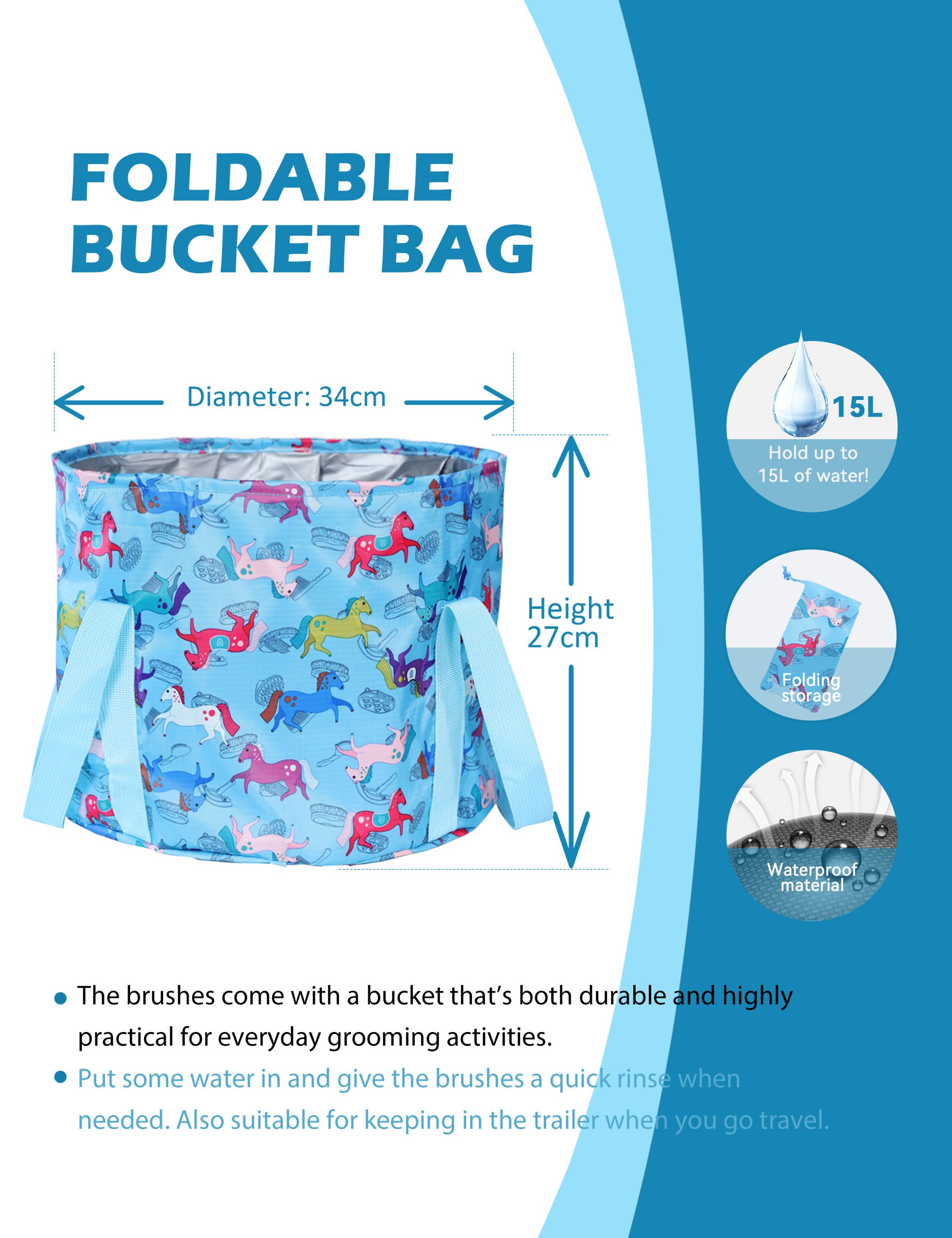Portable Water Bucket: The horse grooming set comes with a foldable tote bag that not only neatly stores all the brushes but also doubles as a mobile water bucket. This convenient feature allows for quick cleaning of brushes or your horse, eliminating the need to carry a separate bucket for on-the-go grooming.