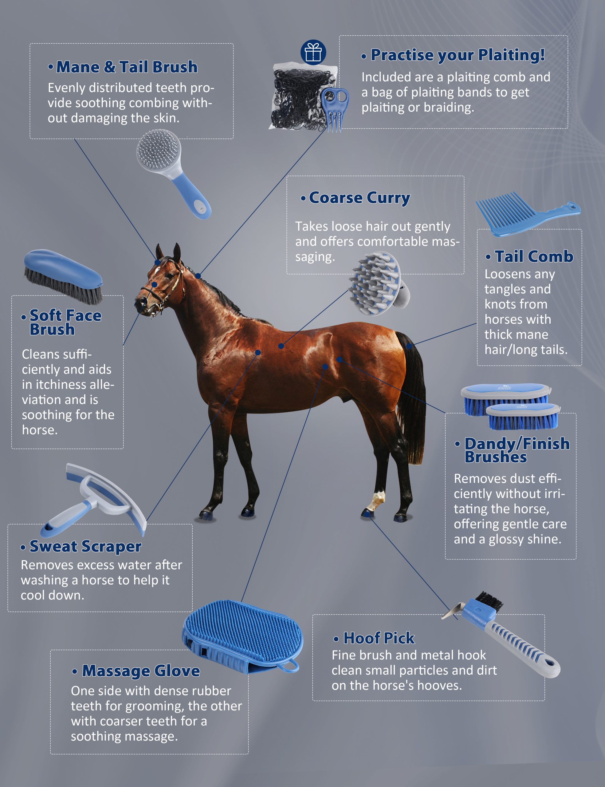 Complete Grooming Kit: This horse grooming kit includes a variety of brushes to meet all your horse grooming needs. It contains a dandy brush, body brush, soft face brush, coarse curry, sweat scraper, hoof pick, tail comb, mane & tail brush, and massage glove, along with a pack of rubber bands for styling the mane and tail. The comprehensive set ensures thorough and detailed cleaning.