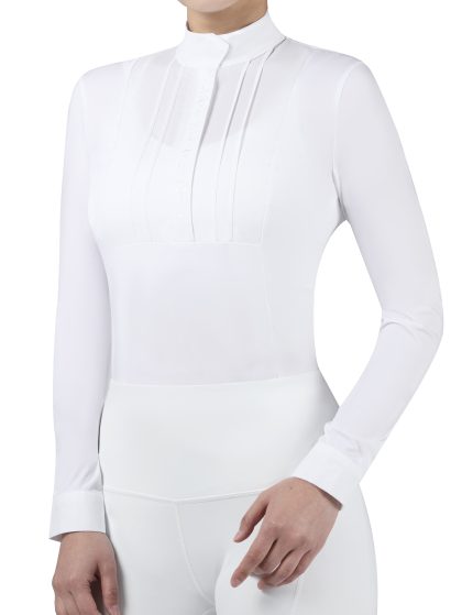 Elegant Embroidery & Rhinestone Cuffs: Beautifully crafted pleats are complemented by delicate embroidery, enhancing the shirt??s figure-flattering silhouette. The shirt-style cuffs with rhinestone buttons add a touch of refined elegance, perfect for both competition and casual wear.