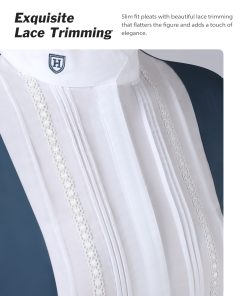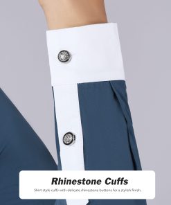 Sleek, Delicate Design: Crafted with elegant pleats and delicate lace accents, this shirt enhances its figure-flattering shape. The shirt-style cuffs with rhinestone buttons add a touch of refinement, making it perfect for both competitive events and casual wear.