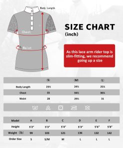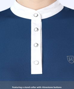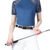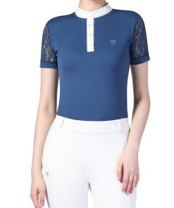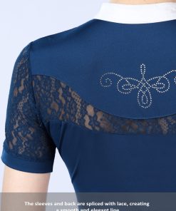 The shirt features a feminine silhouette that flatters and fits easily under a show coat. Elegant design elements such as rhinestone accents on the collar, chest, and back, a rounded show collar, and short lace sleeves add a touch of sophistication. The lace sleeves, which remain invisible under a show jacket, enhance the neck and shoulder while allowing for a wider range of movement and improved airflow.