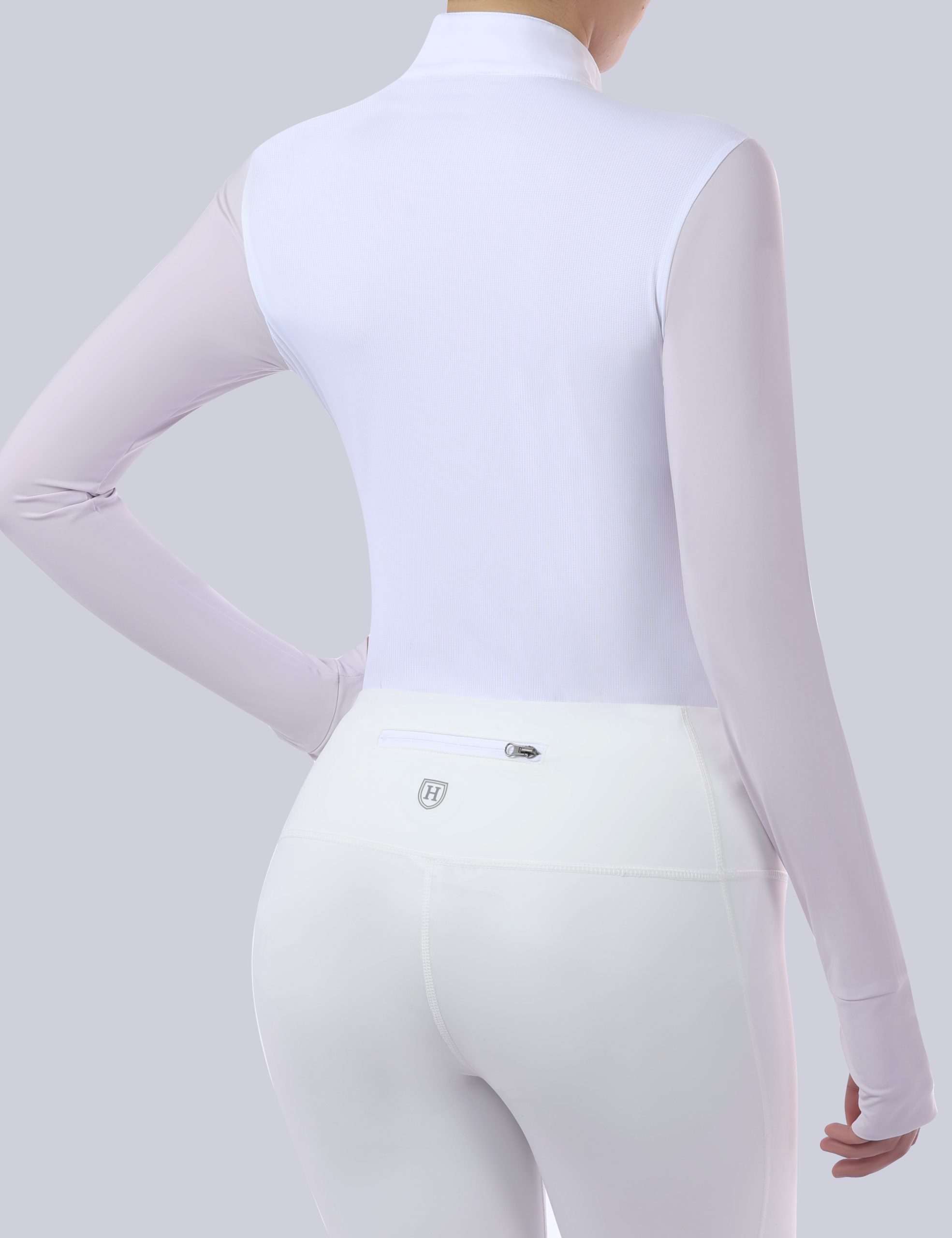 Designed with the equestrian in mind, the Harrison Howard Equestrian Riding Shirt blends elegance, comfort, and performance. The spliced shoulder with delicate embroidery exudes refinement, while the thoughtfully placed thumb holes ensure sleeves stay in place, providing extended coverage during every ride. A small ??H?? embroidery adds a personal touch for riders who appreciate attention to detail.
