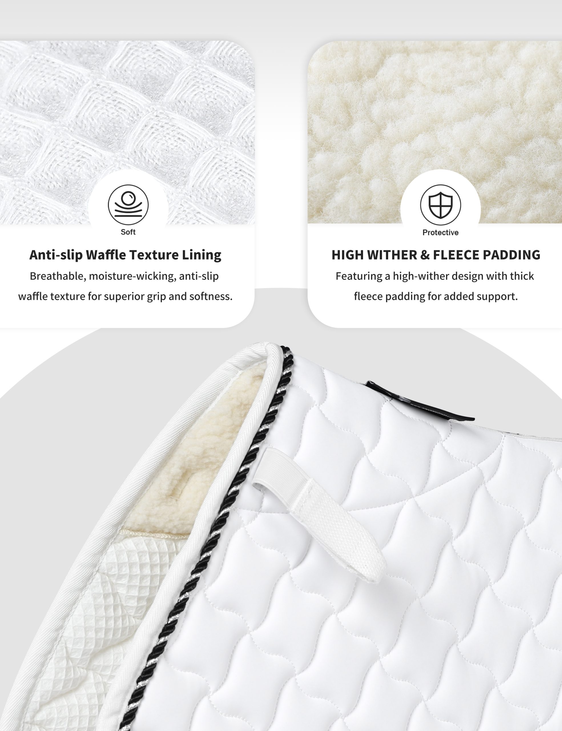 Superior Moisture Control: Your horse deserves comfort. The 65% polyester + 35% cotton blended inner layer pulls sweat away fast, keeping your horse’s back dry and irritation-free. The soft waffle-textured underside provides a secure, non-slip grip while remaining gentle on your horse’s skin – no chafing, just all-day comfort.