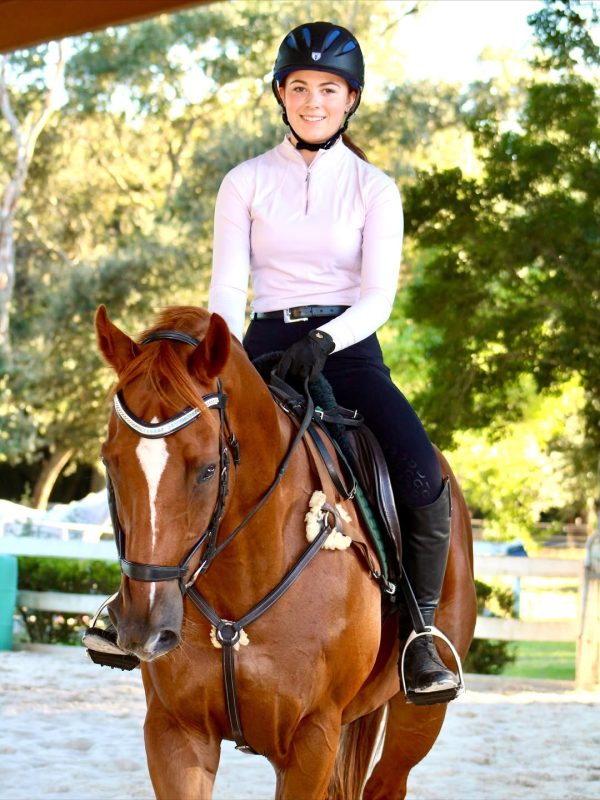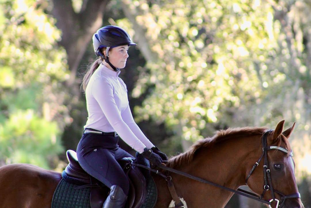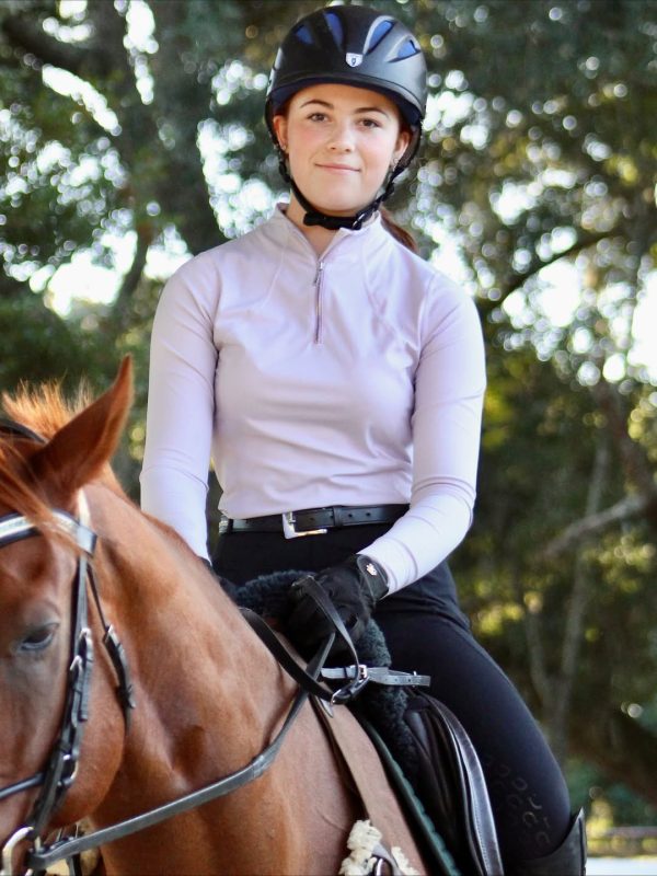 The purple one Maddie chose feels like a small expression of personality — soft, flattering, and just a bit distinctive. It’s the kind of color that looks lovely in the saddle but also works perfectly well when she’s wandering the barn aisle or grabbing a post-ride drink.