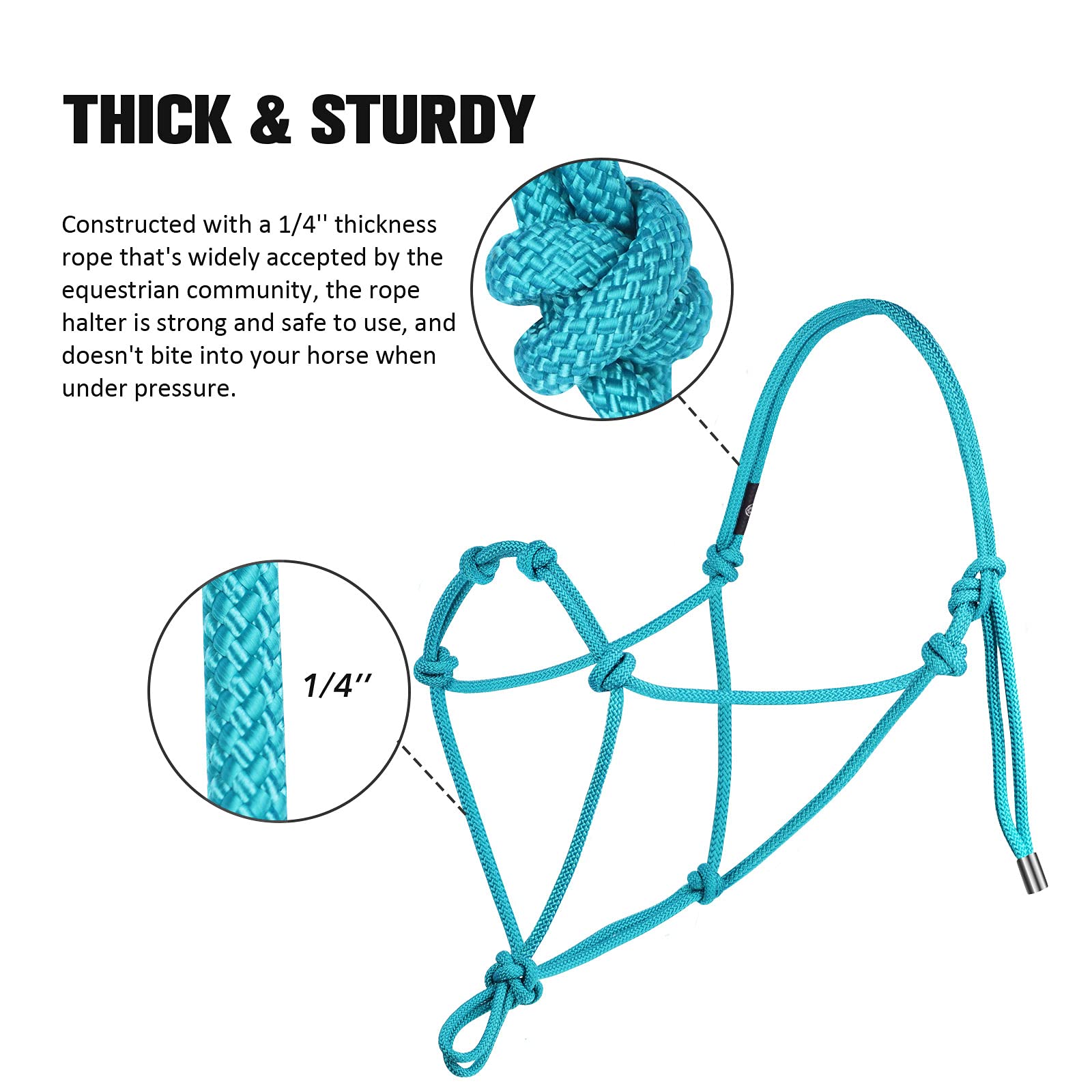 - STRONG ROPE HORSE ROPE HALTER: Made with 1/4” rope, the halter exerts enough force and yet won’t bite into your horse when under pressure. Strong and with little stretch.