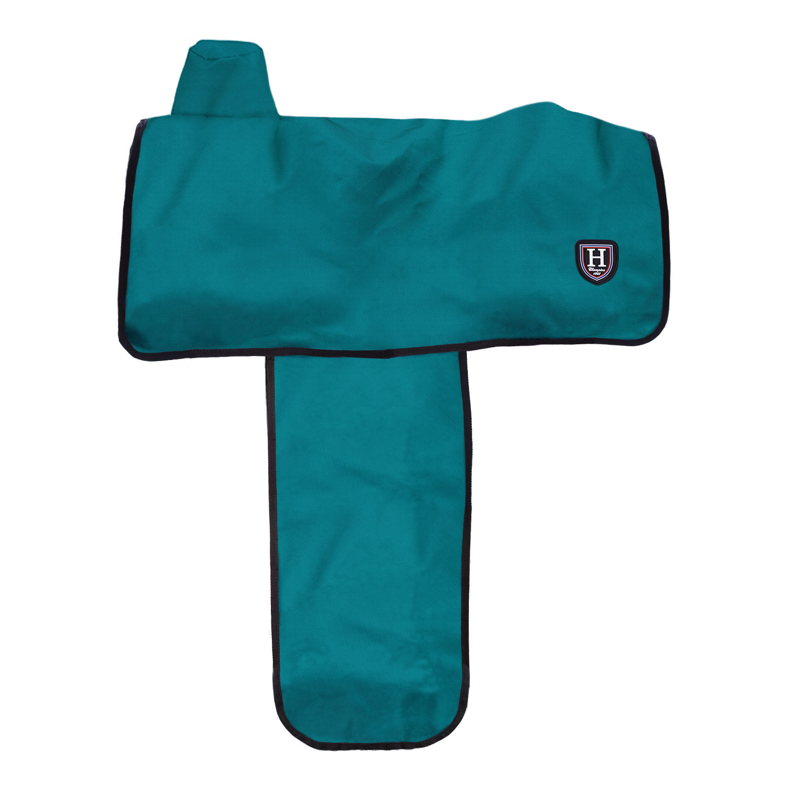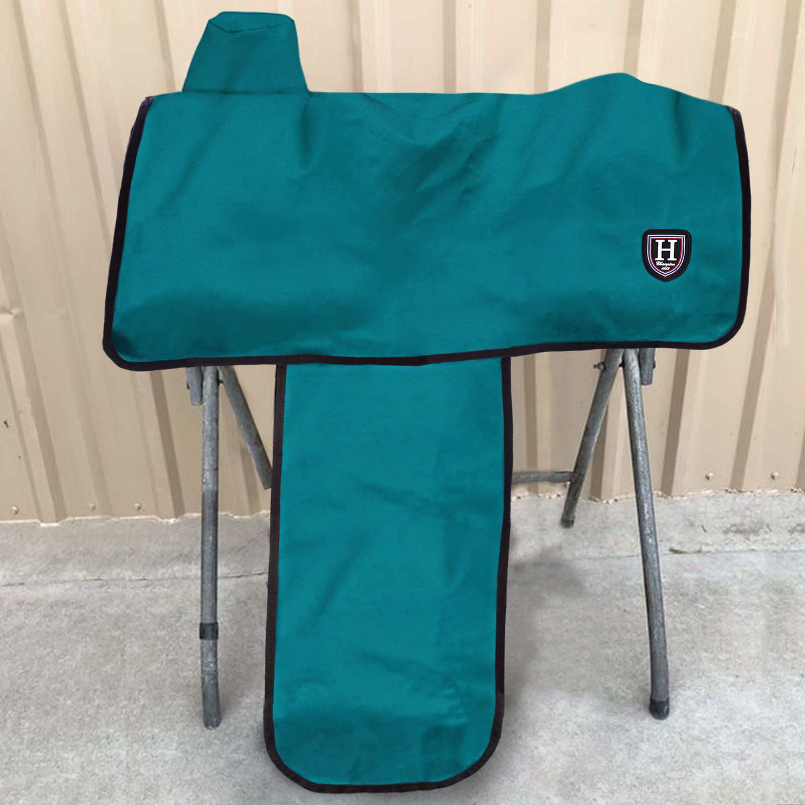 A saddle cover that offers unbeatable protection from scratches, dirt, and moisture. Harrison Howard Essential Western Saddle Cover With Fenders is made from a sturdy and rip-stop outer material featuring a cut-out for the horn to secure the cover to the saddle. This cover is designed to protect your saddle from damage due to water penetration, discoloration, dust/debris, scratches, moisture, sun bleaching, etc. This saddle cover can withstand extreme changes in temperature and humidity and rain or keep your saddle dust free and clean when in storage. Perfect for showing or riding events. Elastic straps in front and back allow easy adjustments to customize the fit of the cover to almost any size and style of a western saddle, with enough storage to cover your saddle’s skirting and fenders. Don’t risk damaging your saddle – this essential saddle cover will keep it safe and looking its best even when in storage. Comes in four dynamic shades – Blue, Red, Teal, Purple, and Black.
