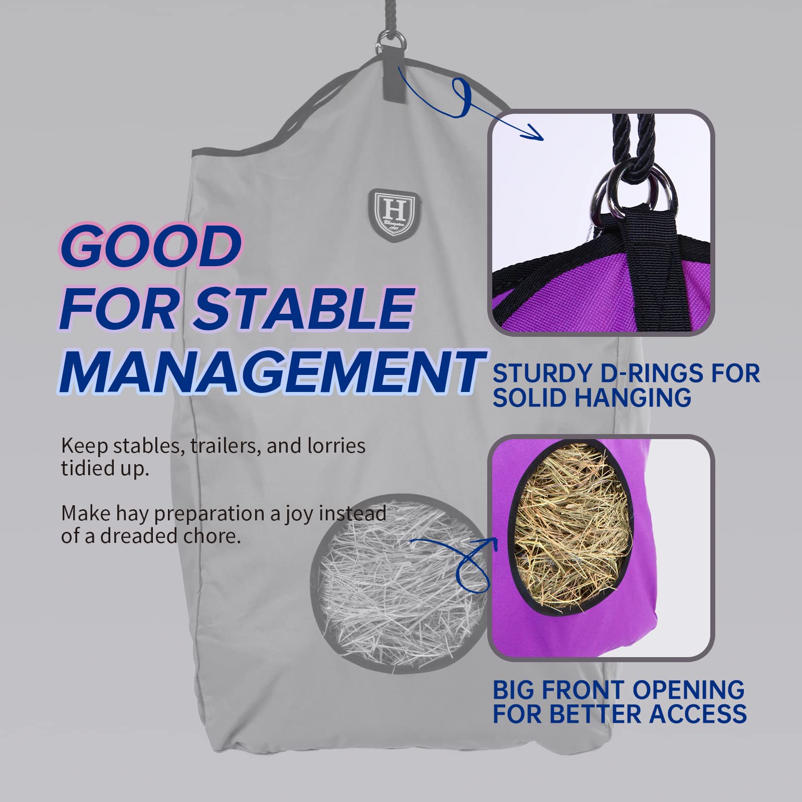 - GOOD FOR STABLE MANAGEMENT: A hay bag is essential to have as it helps to keep stables, trailers and lorries tidied up by reducing messes; it also makes hay preparation a joy instead of a dreaded chore with ordinary hay nets.
