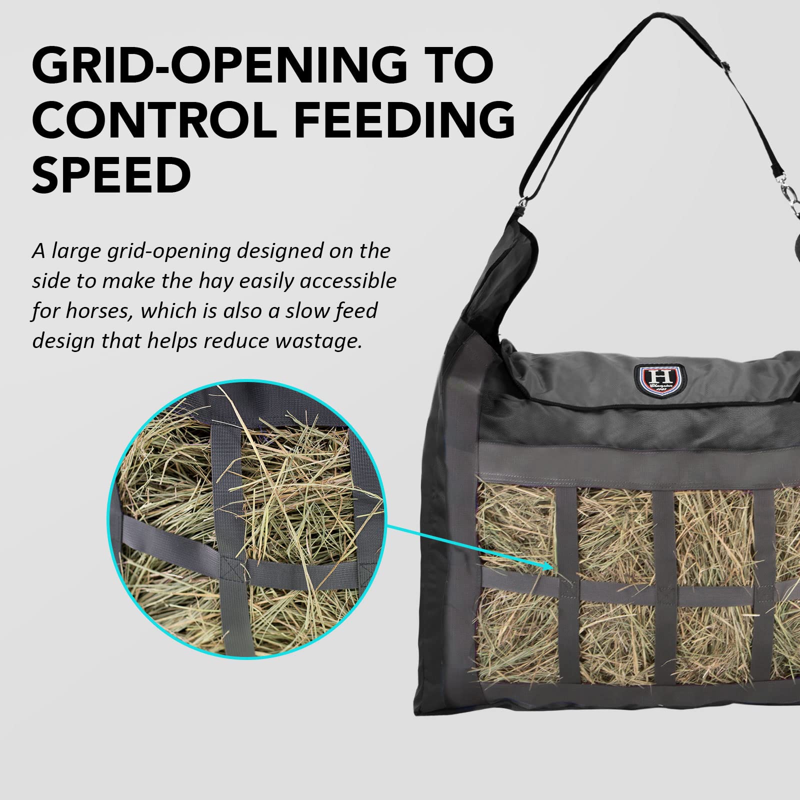 - GRID-OPENING TO CONTROL FEEDING SPEED: A large grid-opening designed on the side to make the hay easily accessible for horses, which is also a slow feed design that helps reduce wastage.