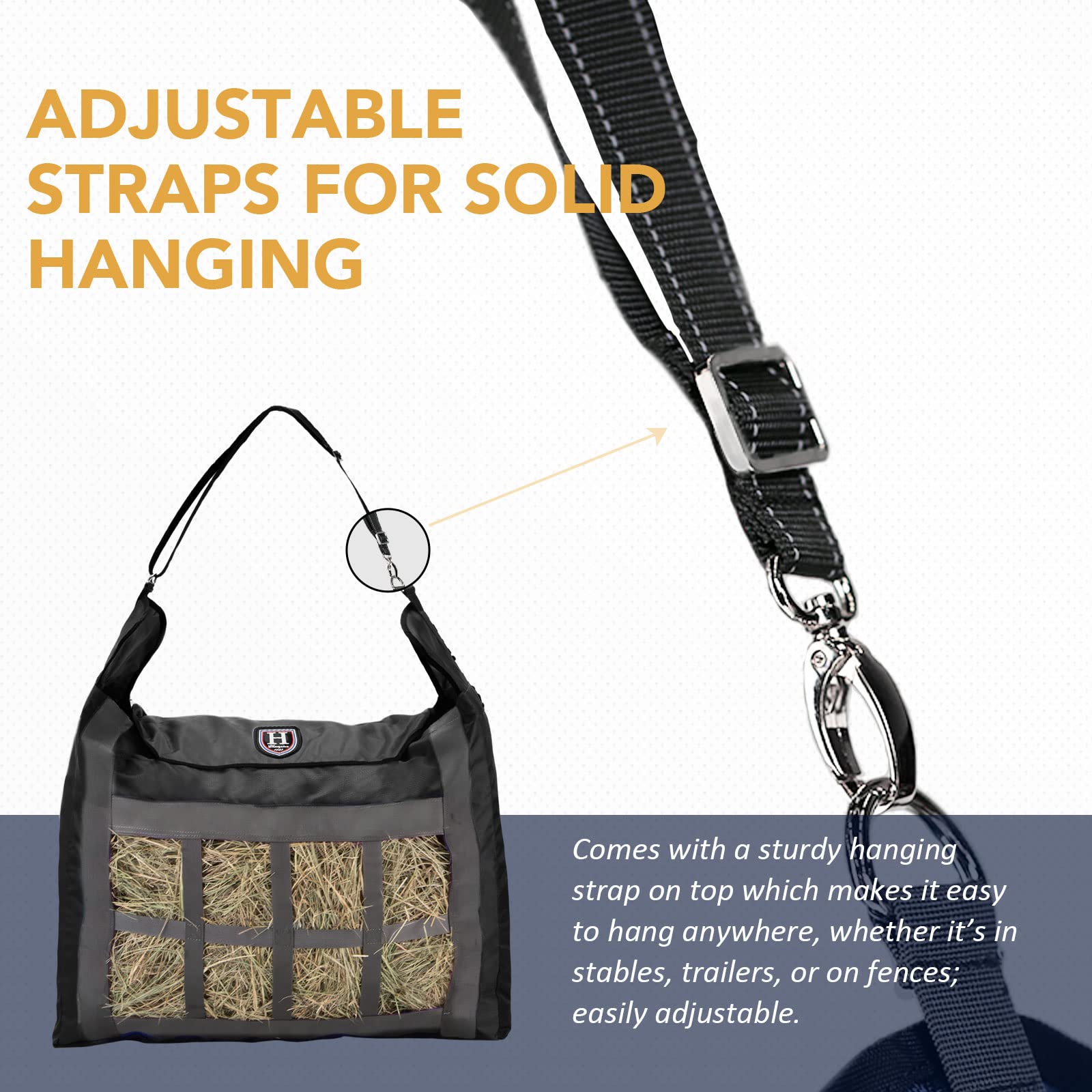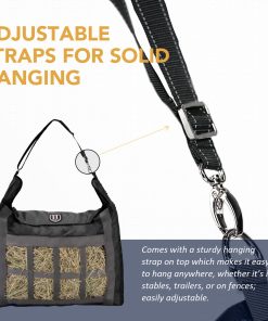 - ADJUSTABLE STRAPS FOR SOLID HANGING: Comes with a sturdy hanging strap on top which makes it easy to hang anywhere, whether it??s in stables, trailers, or on fences; easily adjustable.