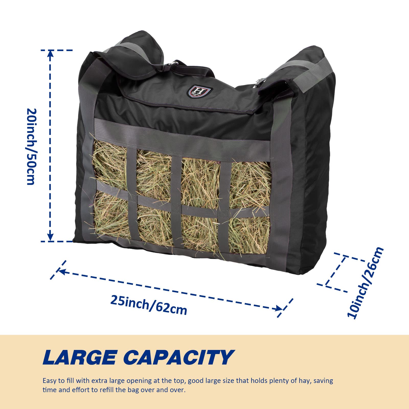 - LARGE CAPACITY: Easy to fill with extra large opening at the top, good large size that holds plenty of hay, saving time and effort to refill the bag over and over.
