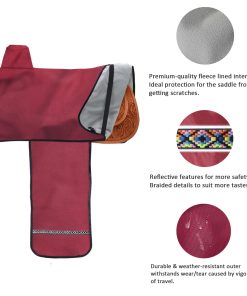 A saddle cover that offers unbeatable protection from scratches, dirt, and moisture. Harrison Howard Premium Western Saddle Cover With Fenders is made from rip-stop outer material featuring a cut-out for the horn and complemented with a soft fleece inner to protect your saddle from getting possible scratches. This cover is designed to protect your saddle from damage due to water penetration, discoloration, dust/debris, scratches, moisture, sun bleaching, etc., meanwhile it can withstand extreme changes in temperature and humidity and rain or keep your saddle dust free and clean when in storage. Perfect for showing or riding events. Elastic straps in both front and back allow easy adjustments to customize the fit of the cover to almost any size and style of a western saddle, with enough storage to cover your saddle’s skirting and fenders. Don’t risk damaging your saddle – this premium saddle cover will keep it safe and looking its best even when in storage. Comes in four dynamic shades with neatly braided elements added to the sides to suit more tastes – Mars Black, Deep Navy, Burgundy Red, Dark Teal.