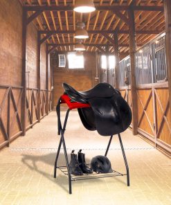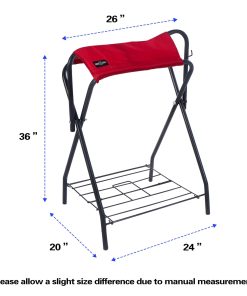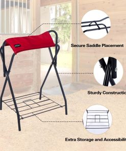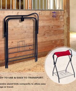 The Harrison Howard Freestanding Saddle Stand with Supportive Fabric is a highly durable and convenient storage solution for equestrian enthusiasts. It features a sturdy construction made from heavy-duty galvanized steel, ensuring longevity and stability for your saddle. The design accommodates both English and Western saddles securely, with added supportive fabric to prevent any slippage. This saddle stand offers additional storage and accessibility with a foldable metal wire rack at the bottom and a handy bridle hook on the side, making it easy to keep all your equestrian essentials within reach. It requires no assembly and is user-friendly, folding flat for effortless storage or transport. This makes it a great option for use both in stables and during shows. The compact folding dimensions (26 x 37.5 x 3 inches) unfolding dimensions (24″L x 26″W x 36″H) ensure it fits well in any space, adding to its versatility as a portable equestrian accessory. This saddle rack is not just a storage solution, but an enhancement to your equestrian lifestyle.